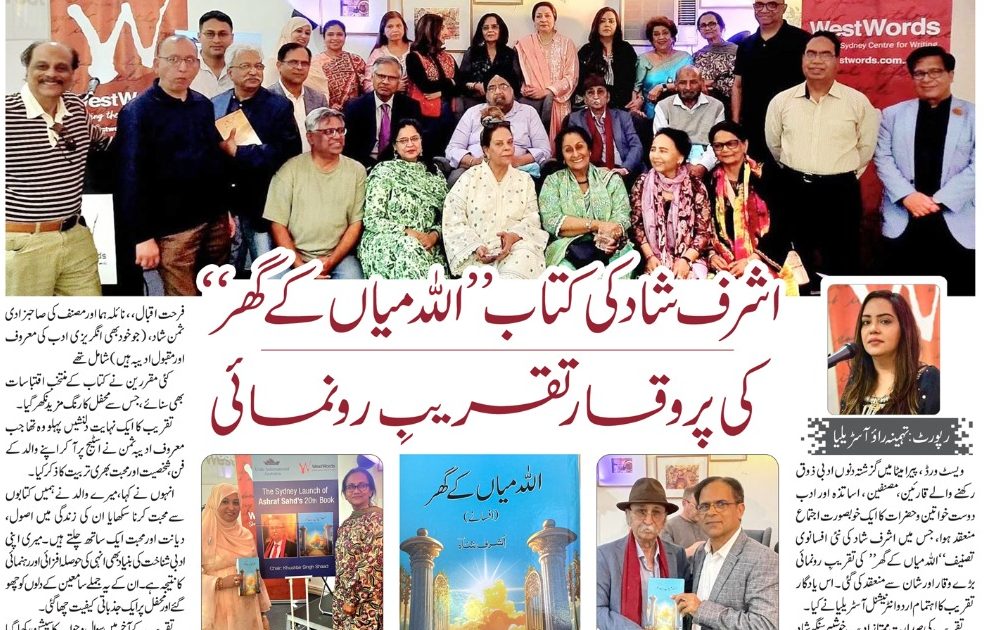 ویسٹ ورڈ ، پیرا میٹا میں گزشتہ دنوں ادبی ذوق رکھنے والے قارئین، مصنفین، اساتذہ اور ادب دوست خواتین و حضرات کا ایک خوبصورت اجتماع منعقد ہوا، جس میں اشرف شاد کی نئی افسانوی تصنیف ‘‘اللہ میاں کے گھر’’ کی تقریبِ رونمائی بڑے وقار اور شان سے منعقد کی گئی۔ اس یادگار تقریب کا اہتمام اردو انٹر نیشنل آسٹریلیا نے کیا۔
