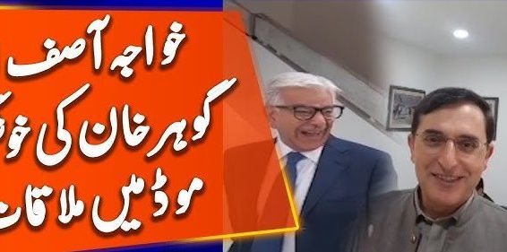 خواجہ آصف اور بیرسٹر گوہر کی ملاقات، مصافحہ اور قہقہے