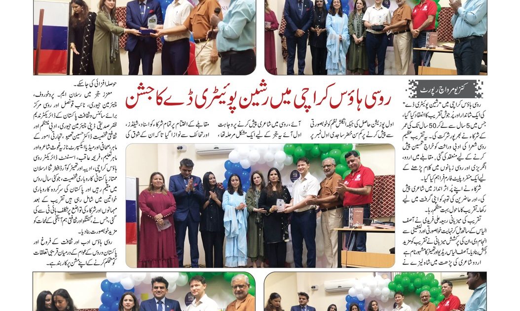 روسی ہاؤس کراچی میں “رشین پوئیٹری ڈے” کی ایک شاندار اور پُر جوش تقریب کا انعقاد کیا گیا، جس میں 5 سال سے لے کر 50 سال تک کی عمر کے 25 سے زائد شرکاء نے بھرپور شرکت کی۔ یہ تقریب عظیم روسی شعرا کی ادبی وراثت کو خراجِ تحسین پیش کرنے کے لیے منعقد کی گئی , مقابلے میں اردو، انگریزی اور روسی زبانوں میں کلام پڑھنے کے لیے ایک منفرد پلیٹ فارم فراہم کیا گیا۔شرکاء نے اپنے پُر اثر انداز میں شاعری پیش کی، اور حاضرین کی توجہ کو اپنی گرفت میں لیے رکھا ۔ تقریب کا ماحول بہت منظم رہا۔