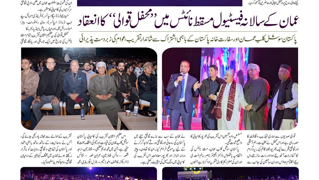 پاکستان سوشل کلب عمان نے سفارت خانہ پاکستان کے باہمی اشتراک سے مسقط نائٹس فیسٹیول کے اوپن تھیٹر میں ایک روح پرور قوالی نائٹ کا کامیابی سے انعقاد کیا، جو مسقط نائٹس کے سرکاری ثقافتی پروگراموں کا حصہ تھا۔اس شاندار تقریب کو عوام کی جانب سے زبردست پذیرائی حاصل ہوئی اور 4,000 سے زائد افراد نے شرکت کی، جس کے باعث یہ پروگرام مسقط نائٹس کی تاریخ کے یادگار اور سب سے زیادہ شرکت والے ثقافتی پروگراموں میں شمار کیا گیا۔ یہ شام روحانی اور ثقافتی اعتبار سے نہایت مسحور کن رہی، جس میں ممتاز قوال استاد فرید ایازاور ابو محمد نے اپنے بھائیوں کے ہمراہ کلاسیکی قوالی کی دل موہ لینے والی روح پرور محفل سجائی اور حاضرین کو مسحور کر دیا۔